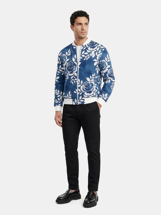 What makes the men's denim bomber jacket so unique?